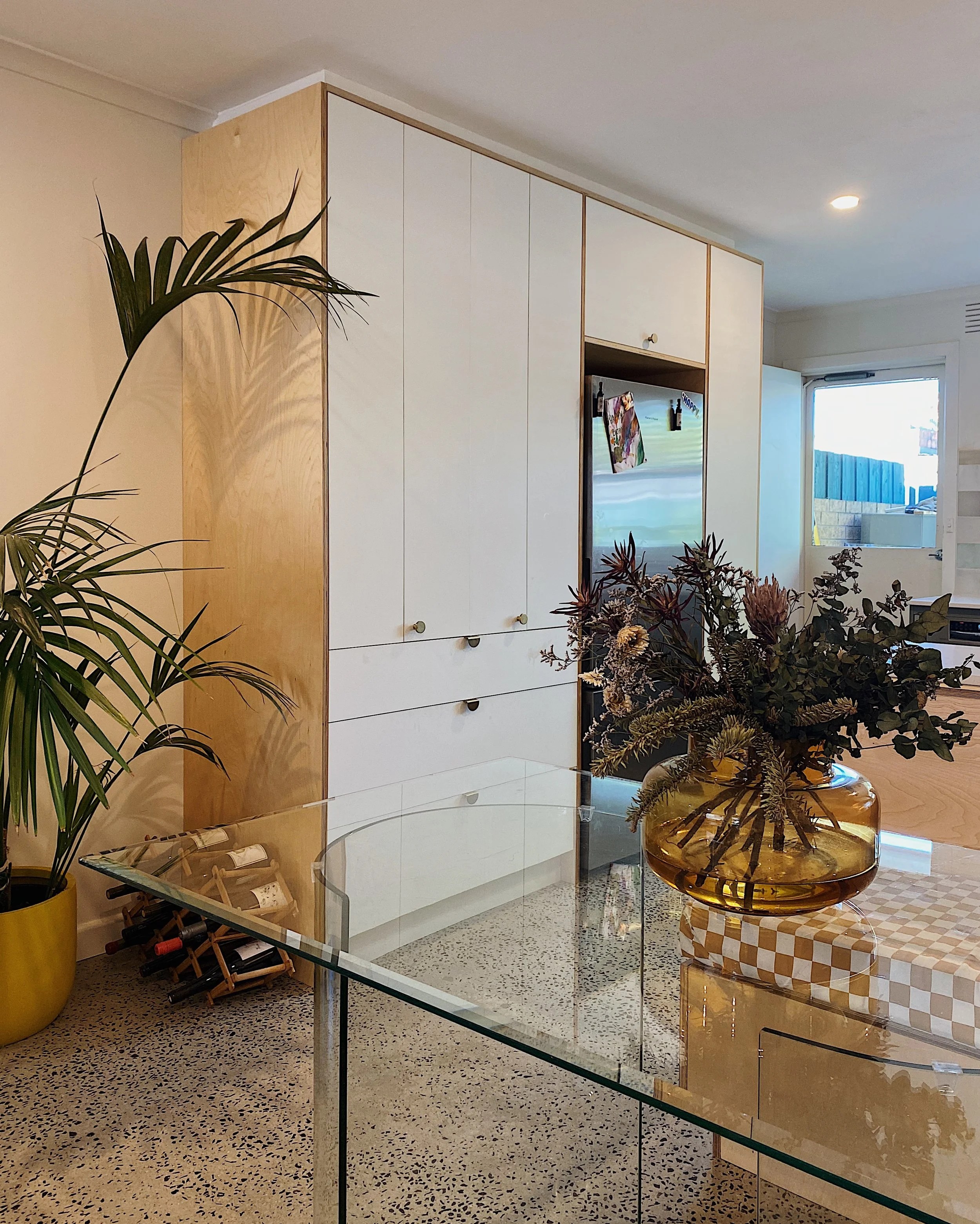 The pantry, fridge and tall storage has been designed as a piece of furniture which is subtly differentiated from the wall behind, elegantly concealing the high functioning area within.
